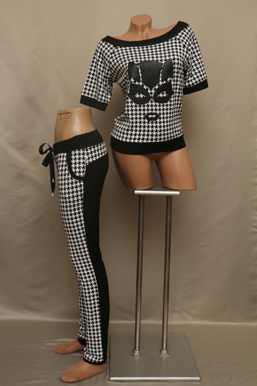 штани звужений силуету, зі шнурівкою на поясі і двома бічними кишенями, перед штанів чорно білий , зад штанів чорний;