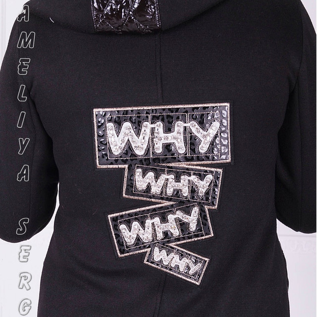 Прикрашальні елементи: декоративна тасьма уздовж застібки змійки, у бічному шві розбовтується функціональна блискавка (необманка), яка злегкістю може прикрасити кардиган бічними розрізами; на спинці дуже гарна, декоративна нашивка з пришивними стразами; дуже грайливо мають помпони з натурального хутра, візуально вони дуже полегшують усю композицію
